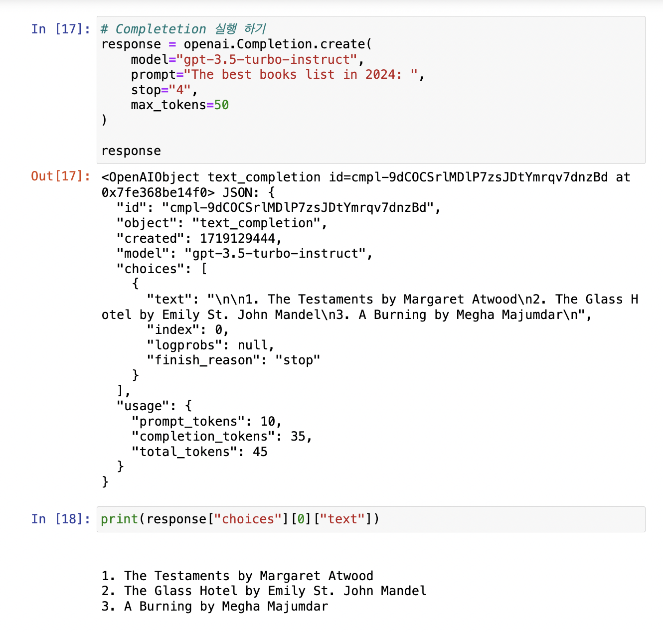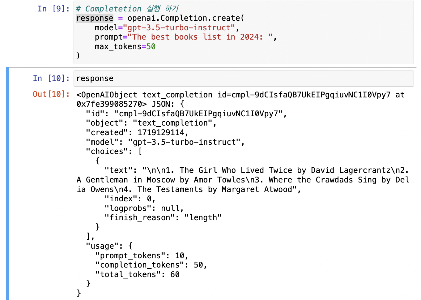 - completion_token이 50으로 해당 위치에서 잘 끊겼다.